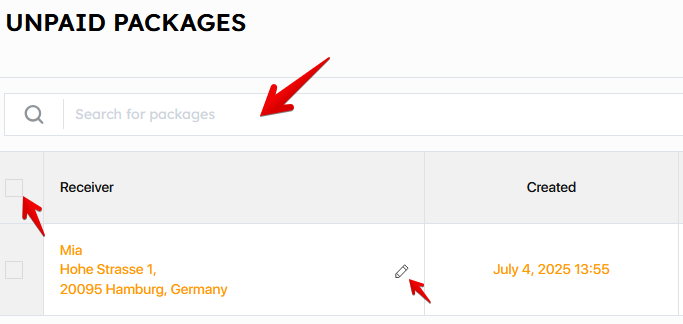 In the “Unpaid packages” you will find all data records that have either been created manually or those that have been imported.