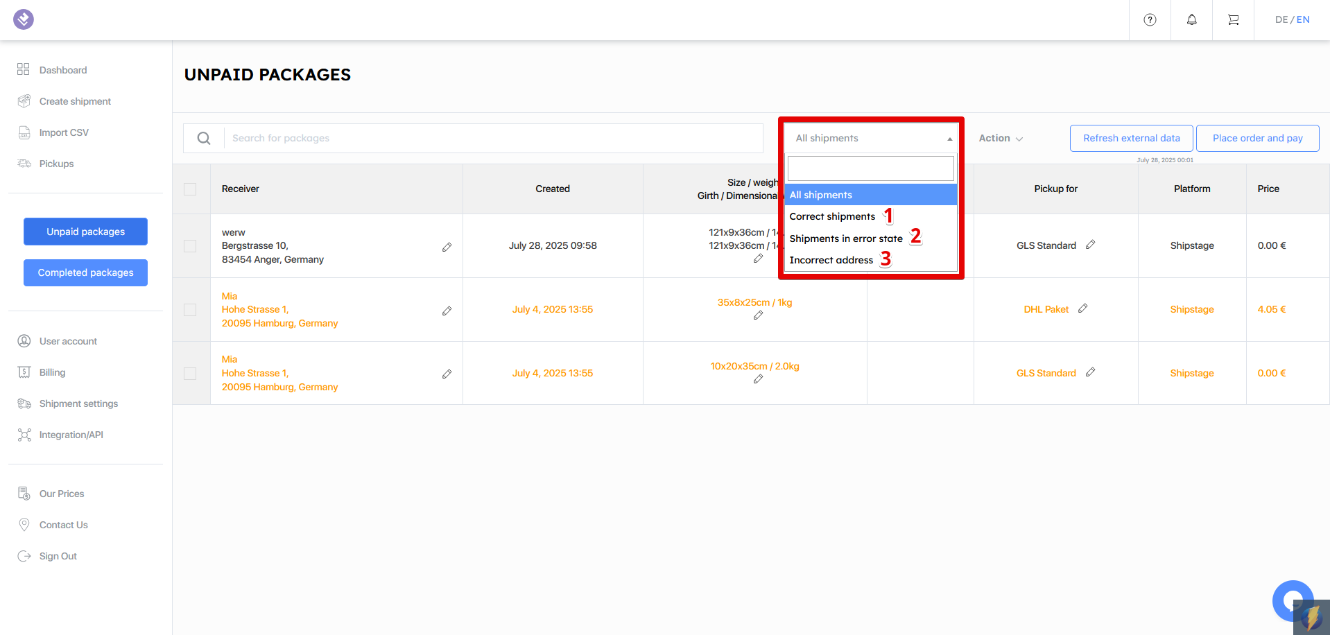 Shipments in error state: All yellow-marked shipments for which shipping labels can also be created and paid, but where potential sources of errors may exist. These shipments should possibly be reviewed again.