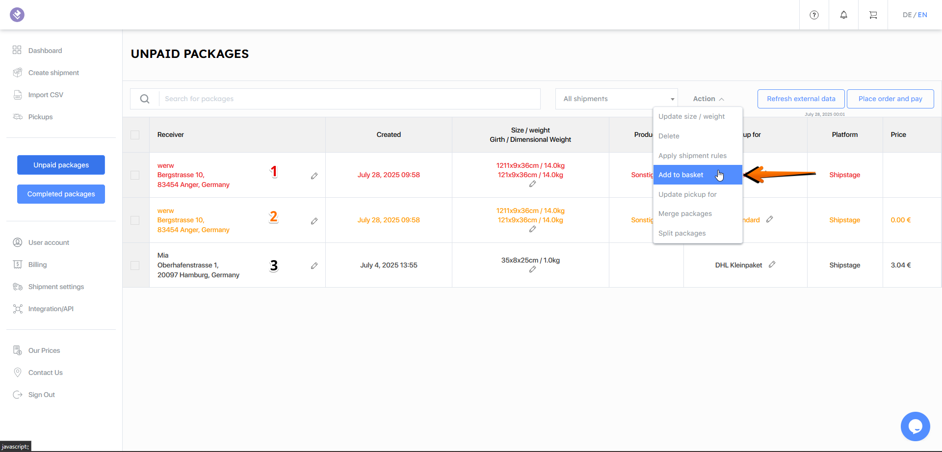 If no error message is given, the shipment is completely valid. It can be created and added to the shopping basket without any restrictions.
